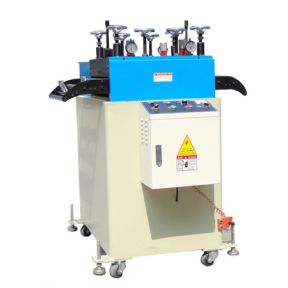本機(jī)采用大型氣缸壓料,整平調(diào)整采用同步蝸輪蝸桿調(diào)節(jié),手柄轉(zhuǎn)動(dòng)一圈,整平上輪僅下降1mm,可做精細(xì)調(diào)整;
